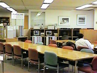 ![]() 静かでゆったりした館内。向こうに見えるのが検索端末 |