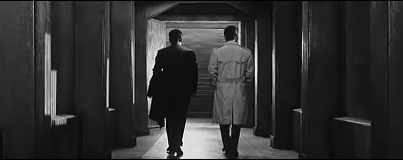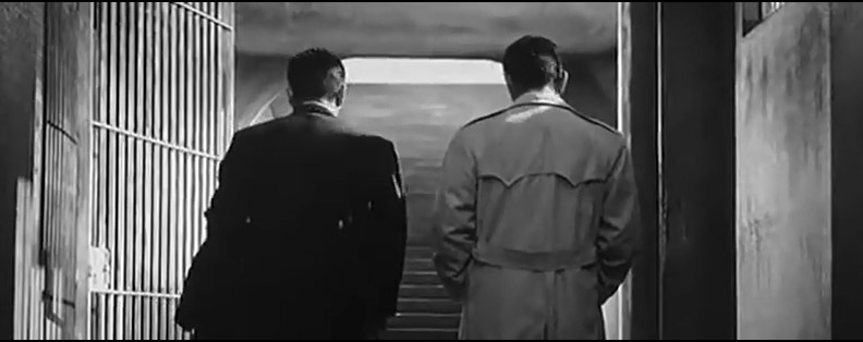 ところで面白いことに、このカットされたラストシーンは予告編に使われている。しかも3分半の予告編の中で20秒弱と結構長く使われているのだ。通常、予告編は助監督などが作るが、せっかく撮ったのだからもったいないと考えたのか、本編にない場面だから予告編に出してもネタばれにはならないと考えたのか。黒澤も予告編は見ているはずだが、特にこのシーンが削除されず残っているということは、シーンの出来に文句があったわけではなかったのだろう。予告編の20秒弱のシーンは、刑務所の廊下のセットで、歩き去る二人をカメラが後ろから追いながらワンカットで撮られており、おそらく残りも含めた全体がワンカットだったと思われる。最後に見せる冬空が本物の空だったか気になるところだ。(そうするためには大掛かりなオープンセットを組まねばならない。)20秒弱の映像の最後、階段の上にちらりと空が見えるが、残念ながらそれが本物の空か書き割りなのかは分からない。