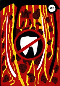 歯に禁止マークで「噛むなよ」。ではバックの不思議な絵柄は何? 「舌の構造断面図」とは本人の弁。ま、嘗めるんだから舌だわな、確かに。