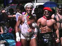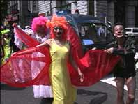 今回は団体での参加をやめ、個人参加という形をとったUC-Galop(*2)の面々と一緒に行進をしたのだが、予定していた車の手配が何かの手違いでうまくいかなかったとかで、音楽もなく、去年より少し地味な感じもした。でもレインボウ・カラーの6人のフェアリーたちを始め、キャンプな雰囲気は充分だった。