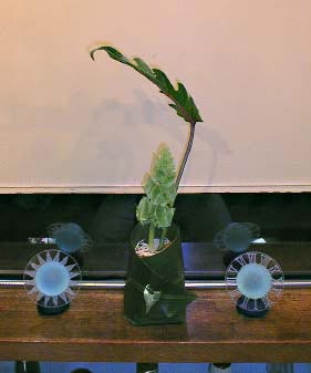 今月タックスノットの展示を担当してくれたイズミがかわいい生け花を持ってきてくれた。その生け花に、オカビーとサエキがくれたガラスのオブジェがぴったりだったので並べてみると、双方引き立てあってなかなかいい感じ。これがその写真。