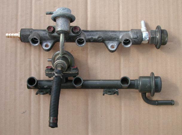 写真上が、パルセーションダンパー有り/ニップル付きのデリバリパイプ。下がAZ−1純正。