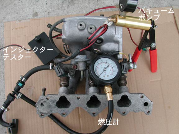 さらに燃圧計やバキュームポンプを接続する。左上の黒い箱はインジェクターテスター。