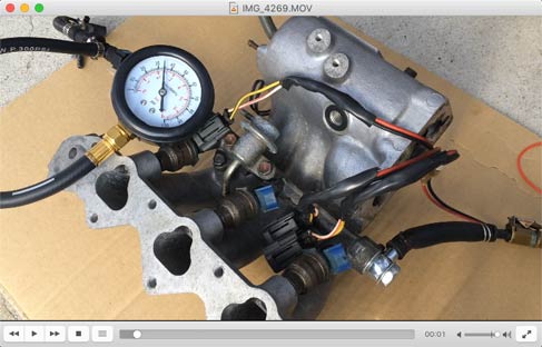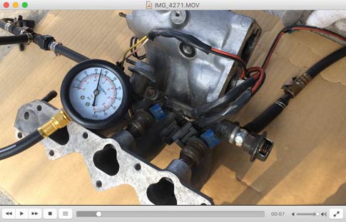 最初にパルセーションダンパーが無いデリバリパイプで試してみた。ムービーではシャッタースピードの関係で、燃圧計の針がゆっくり動いている。実際は激しく振動している。この針の振れが、圧力の変動を示している。