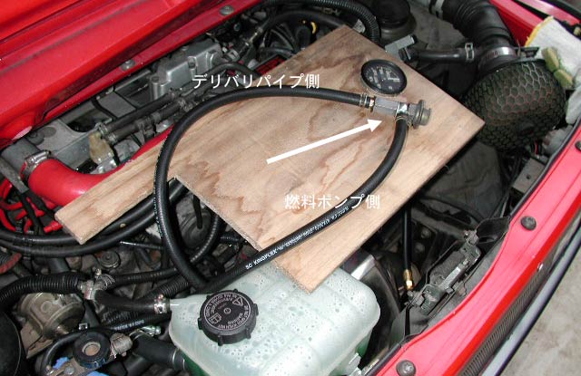 矢印が自作のパルセーションダンパー。ここにパルセーションダンパーを持ってこないと撮影ができないのだ。ホースは片側が燃料タンク側、もう一方がデリバリパイプ側に接続されている。