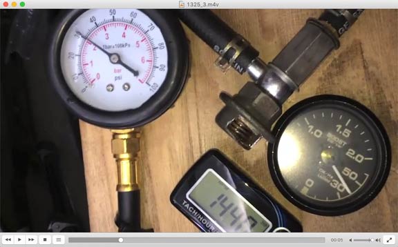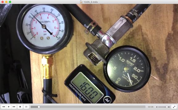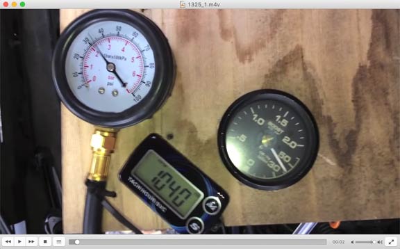 最後に、空ふかしのみの映像を見ていただこう。こちらの方は振動が少ない分、映像の乱れが少なくわかりやすいかもしれない。着目して欲しいのは燃圧計と連成計の動き。吸気管負圧が大気圧に近づくと、燃圧が上がる傾向が見て取れる。それにあわせてパルセーションダンパーのバネは縮む方向へ動く。が、バネが細かく動くということはなく、燃圧の脈動を吸収しているようには見えない。