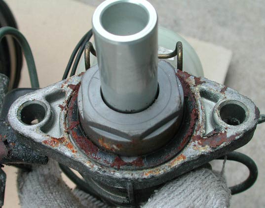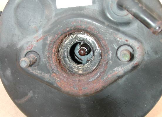 マスターバック側をみると、やはり少し漏れている跡がある。フルードが少し漏れて錆が発生し、その錆でマスターシリンダー外への漏れを食い止めているというような状況だと思う。
