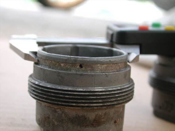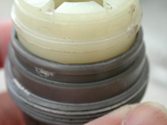 内径に違いはあるのだろうか。キャップ内部には凹みがあるため正確な測定がちょっと難しい。そこで内部構成部品の一部を入れてみた。写真左が未対策品。双方ともガタなどなかったことから、内径は双方とも同じと判断する。