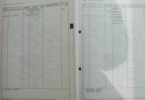 古い物と何が違うかというと、どの車台番号の車から部品が変わったかを示す情報がアップデートされている。下の画像は、パーツカタログを見開きで撮影したもの。画像中央下右側に脚注のようなものがある。