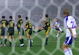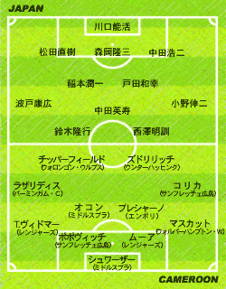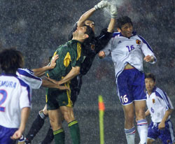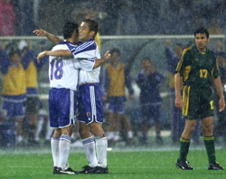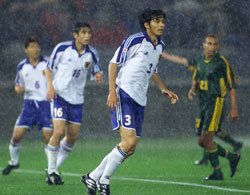 中田 印象はマークがズレてしまうので困ったことです。 ──決勝は出るのですか ──この大会で日本のW杯の可能性がどうなると思うか ──フランスに5−0で負けているので、そのフランスとみんなは決勝を戦いたいか ──これだけの雨の中でプレーしたことは ──パルマ、アーセナルなどからの移籍オファーにについて教えてください ──再び、決勝はどうするのでしょう ──ピッチで試合後、監督と長く話していましたが ──FKについて ──スタジアムはホームということで有利でしたか ──この決勝進出の意味は ──ゴールの感想は ──ホームはやりやすいか 前半は絶好のポジションでFKを奪う働きをしながら後半11分に退場してしまった鈴木隆行「本当にすみません。話すこともないんで(と、負傷した森岡を楢崎と共に肩で支えて、頭を下げながらミックスゾーンを去った)」 前半22分に負傷退場した森岡隆三(右足首の打撲の可能性)「打撲ですね。何とか走ってみたんですが、足がかくかくして力が入らなくなってしまいました。今は冷やしているんで感覚がない。控え室でずっとモニターを見ていました。でもあんなに時間が経つのが遅い試合ははじめてでした。決勝はまだわかりませんが、韓国に行かない分、(足の治療に)時間があると思うんでなんとか治したい」 絶好のシュートチャンス2本を外した森島寛晃「すみません(と気を付けの姿勢で頭を下げて)。雨のせい? 全然そんなことはありません。関係ないですよ、そんな条件は。あれを入れないとちゃんと評価して認めてもらえないんですから、入れないといけない。途中から出て、きょうは役割もはっきりしていました。決勝まで準備ができるので(移動がなくなって)いい準備をして勝ちたいと思う。豪州は中盤もうまく、加えてタフ、という感じでした」 右サイドでフル出場の波戸康広「オーストラリアは速いという感じではなかった。けれども体の使い方はとてもうまかったですね。雨があまりにもひどくて最初はちょっと戸惑ったけれど、チームも自分も最後まで落ち着いて、我慢ができたことが勝利につながったと思う。(代表の試合に慣れてきたか? と聞かれて)まだまだですね」 守備固めで入ったところ、すぐに退場者が出てしまった服部年宏「計算違ったけれどね。でもこういう真剣勝負って本当に楽しい。充実感あるししんどいし、それでまた決勝があるって終わりじゃないのがまた楽しいよね。同じ左サイドといっても伸二とは違う役割だから、守備をしっかりやろうという気持ちはあるし、長めのボールをうまく出していこうと思った」 前線でボールを追い、チームに貢献した西澤明訓「(鈴木の退場は)あれはマズかったねえ、(チームに)こたえた。けれどもああいう時にも耐えてカウンターというのもできる強さは感じてました。こういうゲームで1−0で勝てたことはものすごい自信になったんじゃなかと思う。体ですか? うーんかなり疲れてますが、しっかり休養をして決勝でいいプレーをしたい」 4試合で左サイド先発出場の小野伸二「今日は何もしてません! あのFKは、中田さんが中にもう一人いるんだから、強いキックを蹴ったほうがいいということでああなりました。今日はあまりにも(雨が)ひどくてびっくりしましたけど、ハーフタイムに雨用(取り替え式のスパイク)に履き替えました。ただ、1戦ごとに、持ち味がなくなっているような……」(なお、移籍についてはオランダからのオファーは確認しているそうだ)
