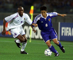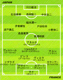 前半には積極的にシュートを打つなど、3月とは違った展開を試みた伊東輝悦「フランス相手でもこうして落ち着いて入ればチャンスはなんとか作れるんじゃないかと手応えはあった。ただ、ボールをいくら回しても肝心のペナルティエリアに入ることができない。個人的にも、前を向くことができないことが反省点。前半のシュートのように折り返してああいうチャンスを狙って行きたかった。フランスは寄せがうまい。中盤は常に狙われている感じがしていた」 スペイン遠征では体調不良で直前にリタイアしたが、今大会は安定したプレーを見せた戸田和幸「持てる力はすべて出したと思うし、気迫でも負けてはいなかった。代表でこうしていきなり大きな大会を迎えたけれど、それでも、自分が取り組んできた方法は間違いではなかったと確認できた。ただ、今日は負けて終わったことが悔しい。足りないものが何なのかをチームに帰ってしっかり反省する」 守備、ロングパスの起点と、今大会で持ち味を発揮した中田浩二「細かなミスとか、かなりあります。でも、スペイン、フランスで経験した敗戦はきっちりといい方へ変えられたとは思う。フランスは本当にうまくて強い。失点した場面ですが、(ヴィエラは)あれだけ走ってあのシュートですから凄い」 モロッコで見せた突破のような攻撃的な動きを期待され、後半に交代出場した三浦淳宏(東京V)「(ベンチが)『とにかく前に行け、前に行け』と、そればっかりで……。右が上がっていても『行け』と言うし、おまけに『下がれ』まで言うんで、途中でひっかかる(ボールを取られる)し、仕事がごちゃごちゃでしたね。相手のことを考えれば(上がったり下がったりも)仕方ないですが、もう少し落ち着いてプレーをしたかったですね」 4月のスペイン戦で代表デビュー、この1か月で定着した波戸康広「スペインと比べるとフランスのほうが非常にうまかった。強さというのを実感した。スペイン戦のほうが個人的にはうまくプレーをしたと思うが、もう少しビルドアップをしていくことが重要だと思った。収穫は、スピードには自信を持てる点です。今日もアネルカはめちゃくちゃに早かったですが、それでも置いていかれる、という場面はなかった。自信は持てた」 今大会、予選、決勝とスーパーサブとして抜群の存在感を見せたベテラン・中山雅史「走るといっても、前半の最初から(先発出場)だと、向こうも元気ですからね。ああいう(後半の)局面でもできることはありますし。ハーフタイムに西澤から『フランスは来るところはガツガツ来るから』と教えてもらっていた。フランスは後半になってかなりほころびが見えていた。そのほころびから、破り切れなかったところに反省がある」