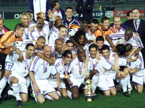 大会を通じて左サイドをやり抜いた小野伸二「相手のサイドにはあまりプレスがかかっていなかったので、積極的にやろうと試合開始してすぐに思った。予想していたよりも楽でしたね。ヴィエラをかわして打ったシュートのようなのを、びっちり決めたかったですね。オーストラリアの試合はあまりいい出来ではなかったので、今日はそのぶんも、と思った。(森島へのいいパスについて)あ、あれはミスキック(報道陣も笑う)。自分でもあんまりいいとこに入ったんでびっくりした。シュートが入っていれば、狙ったパスでした、と言えたんですが。慣れないポジションでしたが、いろいろと考えながらやれることができたと思うし、本当に、久しぶりに楽しめる国際大会でした」 リザラズ「自分としては、2週間遠征してタフなシーズンを終えたことに満足したい。日本は対戦するたびに強くなっていることは間違いない。海外へ行く選手が必要だという判断については、今日だけではまだわからない。いずれにしても、私たちにとって簡単な試合ではなかった」 カランブー「3月の対戦と比べれば、まるで違うゲームだった。私たちが5−0で日本に勝った試合とは、内容、細かな技術面、すべてで大きな違いがあったと思う。日本の選手はとても知性的なプレーをしていたし、(左サイドの小野については)なかなか積極的にプレーをしていた」 岡野俊一郎日本サッカー協会会長「日本は着実に進歩している感じがする。チーム全体に感謝したい。ただ、いくつか改良しなくてはならないところもある。チームじゃなくて組織、組織運営ですよ。交通手段や選手へのホスピタリティー。最終的な情報を集めて活かしたい」 川淵三郎日本サッカー協会副会長「FIFAの関係者もよかったと言ってくれた。大敗の可能性もある相手だし、1−0はよかったと思う。選手もホッとしたというところだろう。ただ、細かいところのミス、開きは、選手もこれから勉強していくと思う。まあ、言い出したらキリがないので今日はこの辺でやめておきます」 フランス/ルメール監督「勝つことはそんなに簡単なことではなかった。今日は点差よりも1−0で勝って終わるということが一番大事だった。日本は非常に成長している。あっという間に急速に伸びてきたことは間違いない。今日の1−0といっても、5−0より楽だったという試合ではまったくない。フィリップ・トルシエのチームはこれからも進歩する。いい方向に進んでいると思う」 トルシエ監督「今日は名誉なことだ。相手はW杯のチャンピオン。このトーナメントではいい仕事ができたと思う。我々が対戦したのは世界のトップチームばかりだった。ブラジル、カメルーン、フランス、オーストラリア。相手はハイレベルだ。我々は大きな自信をつけた。成熟度が増して判断がよくなった。積極的にもなった。将来に向けていい兆候だ。W杯に向けていい取り組みができた」
