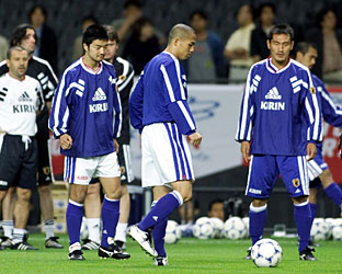 冒頭の練習では、DFの森岡隆三(清水)、松田直樹(横浜FM)、中田浩二(鹿島)、服部年宏(磐田)、宮本恒靖(G大阪)がフラット3のチェックを盛んに行い、監督からのマンツーマンチェックを受けていた。