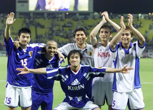 「立ちくらみサッカーでも」 各地で最高気温が軒並み30度を越えるような日、日本代表は、思い切り冷房の効いた室内から一歩外に出たときの、うだるような、あのムッとする「立ちくらみ」のような感覚でサッカーをせざるを得なかったのではないか。前回の札幌でのゲームが気温も23度、湿度も60%程度と空調でコントロールされたのに対して、この日は70%を越え、インジュリータイムの度に全員がピッチの外で水を飲んでいた。 「前半はかなりきつかった。後半になってやっと要領を得て、少し涼しくできるように感じたけれど」と稲本は話したが、後半30分以降、選手の脚は止まってしまい、ほとんど機能していなかった。ロスタイムで3回もの決定的なチャンスを外したことも、服部が「あれではまだ詰めが甘い。課題が残る」と反省する。
