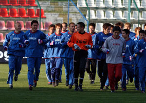 試合を27日に控えた日本代表、トルシエ監督が、試合会場となる前日の会見を行った。代表は4時からの冒頭15分だけを練習公開とした。なお、ポーランド戦の先発メンバーは明らかではないが、練習では、GKに川口能活(ポーツマス)と楢崎正剛(名古屋)、DFに宮本恒靖(G大阪)、松田直樹(横浜FM)、中田浩二(鹿島)、ボランチに稲本潤一(アーセナル)と戸田和幸(清水)、右サイドに市川大祐(清水)、左サイドに小野伸二(フェイエノールト)、トップ下に森島寛晃(C大阪)と中田英寿(パルマ)の2人を置いて、FWに高原直泰(磐田)と鈴木隆行(鹿島)が入り、12人のフィールドプレーヤーでボールを回していた。