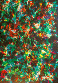 渡部広明版画作品 ナツダ9000の透明度の高いインクと、版に直接の目止めによる描画して版を作り1色ずつ刷り重ねてモノタイプの作品を。個展の会場で制作したナチュラルでプリミティブな音のテープを流す。 100種類位制作、作品展を。