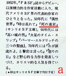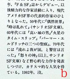 (a)は(A)の、(b)は(B)のそれぞれ表表紙見返りに掲載されているディックの経歴です。予定題名の違いは別として、決定的な相違は50年代作品に「死の迷宮」があるかないかです。この作品は1970年に出版されていますので、50年代に発表されたというのは明らかな誤りです。他社作品ならともかく、自社の作品を間違えるとはさすがに許されなかったのでしょう。ということであわてて(b)に刷り直して掛け替えたというのが真相とみているのですが。