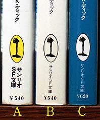 「暗闇のスキャナー」には3種類のカバーが存在しています。当初私が所有していたのは(B)でこれがBRUTUSの背表紙写真に写っています(本体の奥付は1980年7月5日発行でれっきとした初刷です)。これは黄色火星人なのですが、その下のサンリオSF文庫の文字が普通と異なっています。そのほかの黄色火星人はすべてサンリオとSF文庫の間に改行がはいり、文字も太くなっていますが、これのみ写真のように以後の青火星人と同タイプの印字となっています。さらに裏表紙見返りにはこれ以降発売される作品も掲載されており、表表紙見返りにはディックの経歴に1982年没と書かれています。