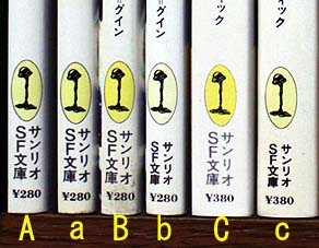 問題はaとcです。版違いではなく、マークがあるかないかのヴァージョンが存在するので異装版と認定します。とくにcは背表紙のサンリオSF文庫の文字も小さくなっており、外観からでも区別ができます。この文字は初回配本の6冊のみ大きなもので、bとcおよび第2回配本以降は小さくなっています。