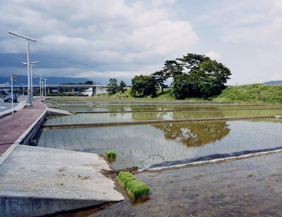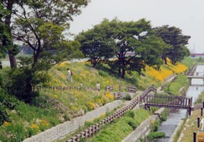 2000年5月27―28日に小田原にテニスに行ったときに、テニスコートの近くにあった田んぼのところで撮ったものです。右手奥の高くなったところは酒匂(さかわ)川の土手です。撮影地点の後ろには、「小田原アリーナ」(小田原市総合文化体育館)というすばらしい体育・文化施設が建っています。小田原在住の方のご協力で、このアリーナに付属しているテニスコートでテニスをすることができました。この田んぼは、周り(つまり「あぜ」、漢字では畦、または畔と書くそうです)がコンクリートで囲われており、田植機のための斜面までが付いているのには驚きました。このアリーナの建設の際に、周辺一帯も整備されたのかも知れません。小田原アリーナと土手の間には、下のような小川が流れていて、いろいろな花が咲いていました(植物の名前は全く苦手で何の花なのか分かりませんでした)。