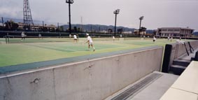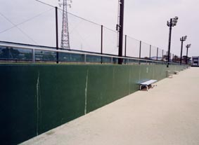 テニスコートもすばらしいものでしたが、よく見ると、建設後3年も経っていないのに、手すりのコンクリートに多数のひびが入っているのが分かりました。写真1の手すりの手前側のへこみの部分に軒並みひびが入っていました。左から2番目のくぼみの部分を拡大したのが写真3ですが、このひびの部分から白い筋が地面まで続いていました。写真2は反対側の手すりをコート側から見たものですが、金属製の手すりの立ち上がり部分から規則的にこの白い筋が地面まで続いていることが分かります。この写真で左から2番目の筋の部分を拡大したのが写真4です。