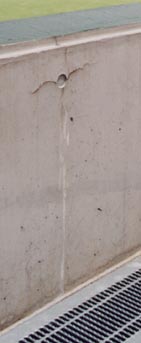の小さな穴は「ピーコン」とか「セパ穴」と呼ばれているもので、コンクリートを固める際の型枠を固定するために必要となる出っ張りの跡のようです。白い線は、アルカリ骨材反応によるものではなく、「遊離石灰」ではないかとのお話でした。「遊離石灰」は、コンクリートに必要以上に加水したような場合によく起こる現象だそうです。素人判断で誤った情報をお伝えしたかもしれませんが、悪しからず。ただ、テニスをやっていた日曜日に、背広を着た人が10人以上この辺りを調べに来ていたことから、これがなんらかの問題となっていたのは確かのようでした。