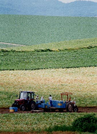 北海道の富良野から美瑛の辺りに広がる丘陵地帯です。撮影は96年8月です。収穫しているのは多分ジャガイモだと思います。この辺りは、故前田真三氏が多数の写真を撮影して発表されたのがきっかけとなって全国的に有名になりました。この近くには、前田真三氏がご自分の写真を展示するために開設された写真ギャラリー「拓真館」があります。88年8月にお伺いしたときには、ちょうどご本人が滞在されていたため、お会いすることができました。ただ、最近ではこの一帯は観光地になっていて、国道237号線沿いに、観光ラベンダー園や観光農場などが点在しています(2000年6月11日)。