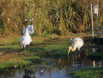 下の写真は丹頂鶴が自然に近い環境の中で飼われているのを見ることができる釧路市丹頂自然公園に飼われていた丹頂鶴の親子です。親鳥は飛べないため、かなり大きな柵から出られないようです。下の写真では、左の2羽が親鳥で、右の羽が茶色い鳥が幼鳥です。