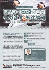 生産設備設計ノウハウセミナー(個別企業様の社内教育は除いてあります) ☆『少人数でできる生産設備類の内製化について』 〜他社と差別化するモノづくりの具体的方策〜 と き:平成18年12月17日(日) 11:00〜12:30 ところ:厚木市勤労福祉センター ボランティア会議室 対象者:域内商工業者 主 催:NPO厚木診断士の会/あつぎ活性化プロジェクト 生産現場の管理手法セミナー(個別企業様の社内教育は除いてあります) ☆『段取り時間短縮に向けた現場改善について』 と き:平成24年11月18日(日) 11:00〜12:00 ところ:厚木市勤労福祉センター A会議室 対象者:域内商工業者 主 催:NPO厚木診断士の会/あつぎ活性化プロジェクト 購買管理セミナー(個別企業様のセミナーは除いてあります) ☆『適正な下請取引を推進するために』 〜下請事業者とWin−Winの関係を築き共存共栄を図る〜 と き:平成22年6月20日(日) 11:00〜12:00 ところ:厚木市勤労福祉センター ボランティア会議室 対象者:域内商工業者 主 催:NPO厚木診断士の会/あつぎ活性化プロジェク ☆『これからの購買管理研修』 と き:平成17年2月25日(金) 9:30〜16:30 ところ:アクトシティ浜松 研修室 静岡県浜松市板屋町111−1 対象者:資材、購買、外注、調達部門などの管理者、担当者の方、 新任担当者の方、本テーマにご興味のある方 テキスト:拙著『図解 よくわかるこれからの購買管理』(同文舘出版) サブテキスト『これからの購買管理研修』 主 催:社団法人 中部産業連盟 外注管理セミナー(個別企業様の社内教育は除いてあります) ☆ものづくりトピックスセミナー 『高品質・低コスト・短納期をめざす 外注管理』 〜外注先企業と信頼関係を築き共存共栄を図る〜 と き:平成21年1月21日(水) 18:00〜20:00 ところ:大阪産業創造会館 4階イベントホール 対象者:中小製造業・経営者及び経営幹部、外注管理担当者 主 催:大阪産業創造館 http://www.sansokan.jp/eve/mts