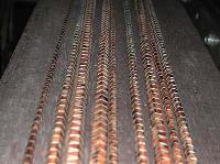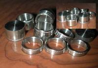 ![]() リールシートパーツの製作です。 洋白(ニッケルシルバー)バーストック からカット、下穴あけが済んだ材料を旋 盤加工します。 画像、加工中。右上は旋盤加工が終了, 次の段階、仕上げ加工一歩手前の状態で す。 |