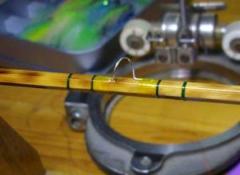 ![]() いつものグリーンでティッピング。エポキシ系塗料 を含ませると、ほとんど透明に。 ガイドのフット、スレッドに覆われてほのかな黄色に。 |