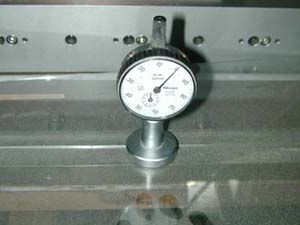 右、 ギャリソン型のディファレントピッチスクリューでの アジャストはスクリューを全体的に軽く回しましょう。 大雑把なアジャストは指だけでできたらいいですね。 プッシュプルスクリューの場合は気楽にどうぞ。多分ネジ 山が壊れてしまうことも無いでしょうから。 左、 ダイアルゲージは使用前に必ず0点合わせを怠らずに ね。これはガラス板の上にそっと置いて行っているところ です。 |