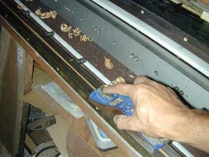 第4章 ラフ プレーニング (荒削り)U 1次削り いよいよカンナでの削り作業に入ります・・・プレーニング フォーム(削り台)に矯正の終わった竹片をセットしカンナがけをして にします。・・・6本の各セグメントを所定の寸法に削りそれぞれを束ね、糸で巻き締め焼入れをする前段階の工程ですね。 V フォームのセット・プレーニング 焼きいれ前のこの段階では仕上げ寸法の60〜70%ほどに削ればOKでしょう。テーパーチャートのフォーム深さのデーターからその 分の数字と《フォーム面とカンナの刃が干渉しない最低限の逃げ・・・・これがないとフォームを削ってしまうことになります》を考慮 した数値をダイアルゲージで確認しつつセットしていきます。 セットを終えたら削り始めます。手前から先端方向へとカンナを押して行き、60度の角を形成していきます。全長にわたって60度の角 がつけ終わったらセグメントを回転させスキン側を除く両面を交互に削ります。曲がりやねじれをしっかり直してあれば楽に作業を進め ることができるはずです。 もし、うまく行かないとすれば・・・カンナの取り扱いがうまくできていないことでしょうか。刃の出す分(切削量)と力加減、そもそ も刃の砥ぎができていない・・・なども大切ですね。