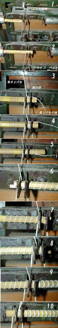 第5章 バインディング・ヒートトリートメント(火入れ)T バインディング 前段階でそろえて削ったセグメントを6本まとめて緊縛しその後熱処理の工程に移ります。 熱処理はロッド制作上とても大事な工程といえますが製作者一人一人の考え方に多少の差があり、その方法や処理具合に「正解」を 与えてくれるデーターは未だ出されていないのが実情です。 この段階でのバインディングの意味は・・・しっかりと巻き締めて熱を加えることによってロッドの曲がりやねじれなどを取り除く、と言う 働きを期待する意味もあります。ですからセグメントも実際に組み上げる序列に従って緊縛する事になります。