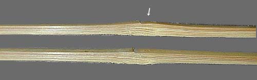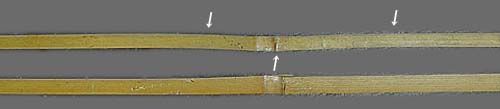 第3章 曲がり直しT はじめに 「竹を割ったような性格」などと言う言葉があります・・・・長い間竹を扱っていると、どうも本来の意味が わからなくなってきました。といいますのも確かに縦に割りやすいことは事実ですが、性格がほとんどの場合ひね くれていて真っ直ぐに割れることはなく・・・根性曲がりのヒネクレ者、それでいて性格が脆い・・・つまり自分 のようなやつの性格を形容する言葉!だったのでは・・・などと思ってしまいます。 それはさておき、素材=スプリットの曲がりは以降の削り・貼り合わせなど工程すべてを困難にしてしまいま すので特に念入りにする必要があります。 U 曲がり @ 節または節前後の曲がり・・・画像brm18は典型的な曲がりを表皮側から見たものです。節を中心に「へ」の字が二つ連なって います。(下のスプリットは曲がりの少ない例です)隣り合った節ではこれとは逆方向に「へ」の字が形成されます。 さらに、画像brm19では裂断面側から見たものですが節自体が盛り上がり「へ」の字状になっています。(下のスプリットは曲 がりの少ない例です) A 節間の曲がり・・・・通常ゆるく大きく左右に孤を描き、表皮を外に内側に曲がることを伴います。 B ねじれ・・・・