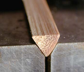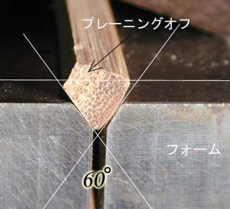 前工程でできた一つの角度が60°になっ た竹片をプレーニングフォームにセットし てみましょう。フォームの溝にはみ出さず にセットできましたか? はみ出すようでしたら曲げ直し工程に戻っ てくださいね。脱線するようですと「削り にくい」「角度が不正確に削れる」「すぐ に刃先が鈍くなって切れなくなる」「怪我 しやすくなる」などなどいやなことがいっ ぱい・・・になります。 あれば荒削り用のでシュルシュルっと削り ます。仕上げ用のでピーっとやってもOK ですね。 ただ、片側だけを削って行かず時折反対側 にもカンナをかける事と根元側から先端側 へと削る事をお忘れなく。 右の画像のようになればOK。 ただし、まだフォームのセットをしていま せんのでこれは練習!!ちゃんとやるには まず、フォームのセットから! |