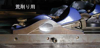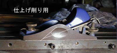 プレーニングフォームの上に置かれた左右の カンナにご注目ください。白の補助線でお分 かりかと思いますが、刃の角度が違っている のがお分かりだと思います。 ここで間違えてしまう方が多いので一言!刃 先の立っているのが仕上げ用です!刃先が寝 ているほうは素材を削り取るというより割り 取る?のイメージ。繊細な作業には向きませ んのでお間違えのないように! ついでに申せば、仕上げ用一丁で竿は作れま す。(勿論プロは両方を使いこなしますが)) |
