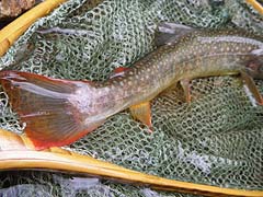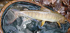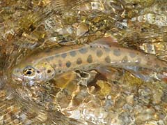 ![]() 今期、3度目の流れ。昨日来の雨のため増水している流れに。 魚は深みのある緩流帯のほか曲流帯内側や水深の浅い障害物の陰で流れの緩い ところで定位している傾向が強いように思えました。 前回のような水深のある流芯脇よりさらに流速の遅い部分を好んでいるらしく、 また、警戒心も平水時より低下しているようでした。 午後、雨も上がり、メイフライや双翅目などが飛び交い始め、フライ日和? とも・・・・。 相棒、KONさんに赤色が印象的な尺クラスイワナ(左)が出、その後Taichiにも 小さいながら赤みの強いイワナが出引き返すことに・・・・・。 帰路、遡行してくる二組の釣り師に合い流れを後にする。 |