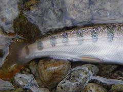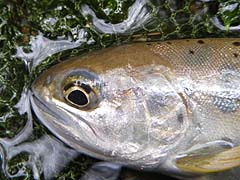 6月4日 ![]() 鼻先が尖り、精悍な容貌(fish by Kon) 午前7時。朝日が濡れた岩を温め始め、身体が軽く感じる。数日前に降った雨は 恵みをもたらしてくれ、多くの食べ物を与えてくれた。だがいまはその強い流れ はなくなり、目の前にはここのところ見慣れている食べ物の数は明らかに減って いる。もっと楽に自分の身体を支えることができ、何よりも、食べ物が多く手に 入るところに移動しよう。 幸い、自分の身に危害を与えてくれるような気配は感じられない・・・・ずーっ と見渡せる広い場所へ。 案の定、食べ物探しは楽になるし・・・・・・と、目を上げると今まで見慣れた 食べ物よりはるかに栄養のありそうな生き物が水面をこちらに向かって漂ってく る・・・・・一応は、今までの生活から学んできたことを元に、漂ってきたもの を観察する・・・・自分が今居る真上を過ぎるまでやり過ごし、すばやく浮上し ながらそれを追尾。「疑う必要などない、かつて食べたことのあるものだ」・・ ・結論から行動まではすばやい。そう、ゆっくり構えていては食べ物にありつけ ないのだ。流れは穏やか、水面の荒れはない。吸い込むようにそれを口に入れ元 の場所に戻るべく流れに逆らう方向へ反転。ゆっくりと元の場所へ・・・・・流 れに逆らう推進力を得ようと身をくねらせ尾ひれに力をこめて・・・・・・の次 の瞬間、頭部に異常な力を感じ・・・後はこの事態から逃れたい!と言うことだ けで無我夢中・・・・・。 河畔を覆う緑のカーテンの下、一部始終をつぶさに目撃。その直前、釣り師の意 識は他のところに浮遊、この瞬間を見逃してしまったとか。ふと我に返った釣り 師のアワセの一くれは見事に今日最高の岩魚・・・・いやー、結構なものを拝見 させていただきました。 雪解け水が落ち、雨の増水が引いて減水気味の流れでしたが魚は総じてヒラキに 出ていてストレス レスな釣りを満喫できました。 |