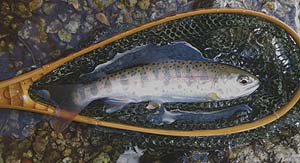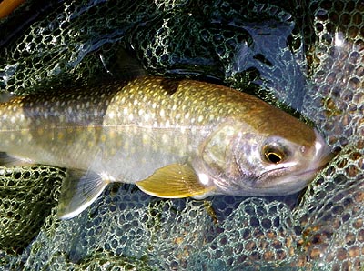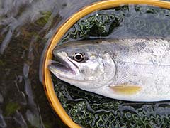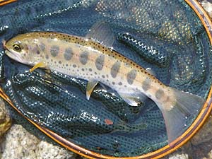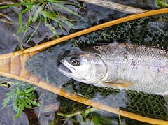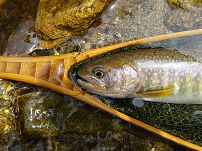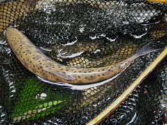 流れはこんな感じ。岸辺には雪。 ![]() 水温は6℃に。雨も小止みに。 そして、フッキングはしないものの10番のフライにアタックするヤマメも出始めると KON氏に待望の一匹目。笑みを押さえ切れません。 フライを12番に換えてようやくTaichiも一匹。(超小物 リールシートサイズ) 次にグリップサイズ(これも小さい!)を追加。 以後徐々にドライへの反応は悪くなり、魚は水底から離れない様子に・・・。ここで ニンフィングへとチェンジ。2匹を追加し、頭上に張り出した木の枝にリーダーを絡め 、竿を収める。 その間、KON氏、BROWN DIPPER氏も釣果を伸ばし、特にSHIMA氏はビッグ1の ヤマメのほか、イワナ(本来この川には生息していないとされる)の9寸!をキャッチ 。 総体的にスローな条件であった流れのなかで十分な満足が得られる釣りができ、幸先の 良いスタートが切れたところですが、例年のごとく、解禁前に入った足跡がありありで 大変割り切れない思いもしました。 |