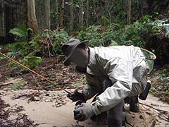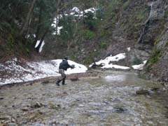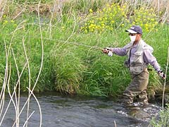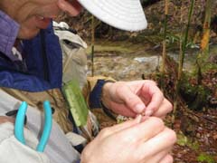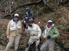 今年も解禁を迎えました。後: Shimachan。 シーズンのスタートはいつもの北の渓流です。 2年ぶりとなる流れは川辺に雪が残るものの水温(8時)は5℃と予想より少し高く、この温度 ならドライフライでの釣りも大いに期待が持てそう、というところ・・・・。水量、水色も例年 と大差が無いように見られます。 さて、シーズン初めて結ぶフライは? 流れを横に見つつフライをセットするBROWN DIPPER氏。 TAICHIは慣習を無視した(?)10番ドライフライでスタート。 本人曰く、魚にも目立たなくちゃ釣りにならないでしょ・・・・とのこと。 |