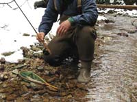 ・・・・・と、フライに茶色い影がまとわりつ く・・・・ヤマメです。ここではフライをくわ えるまでにはいきませんでしたがその後Tai chiのフライにも相棒KONさんのにも、イ ンジケーターにもアタリが。 サイズ的には難ありでしたがシーズン初めを満 喫!!大満足の一日を過ごすことができました。 今年もこの日が迎えられた幸せ・・・嬉しいで すね。と同時に体力のなさを痛感させられもし た初釣りでした。 ![]() ![]() 解禁2日目!!のはず・・・ですが谷の雪に 残された足跡には昨日につけられたものとは 明らかにちがう古い足跡が多く残されていま した。禁漁期に何が目的で?と考えると戸惑 ってしまいますね。そういう人たちでは再放 流は望むべくもないでしょう・・・ 大切に思って欲しいですね。 | ・ |