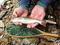3月10日 今シーズンの幕開け。 お初の釣りは解禁から10日も経った土曜日。 例年の初釣りは北の小渓流。 暖冬・小雪ゆえの渇水を心配していましたが 週半ばに季節外れの大雪に見舞われ、以外や 以外、ほどよい水に恵まれました。 ![]() 天気もお誂え・・・・いかに私達、普段の生 活態度がよろしいかお分かりいただけるかと 思います。 一年ぶりの流れに立つ・・・・この日を迎え られ、誠にハッピーな心地が致しました。 コカゲロウ風16番パラシュートを結ぶのも もどかしくキャストを始める。 僅か、3投目にして今シーズン初のヤマメ様 のご挨拶。・・・っと! 昨年のままの7X ティペット、あっけなくもプツリ。 魚はしばらく水面で首を振っていましたが・・ ・・・。 その後が続きません。 気温は上昇傾向なのですが周りの雪が影響し ているのかも知れません。 プールのヒラキで遊んでいるはずのヤマメた ちを見つけることができません。 例年、シロハラコカゲロウのハッチ時期なのですが今年は暖冬。 すでにカディスのハッチに移っているようでした。 雪面にうごめく雪虫(クリカワゲラともう一種類のカワゲラ) と空中をひらひら舞うミッジと黒いカディス・・・春と冬が 同居したような流れでした。 友人が「読み」と「粘り」そして「技術」で手にした超美形 のヤマメ。快心の一匹。 ![]() 快心の一匹、アップ。 この地域特有の姿態をまとった一匹です。 狭く小さく、過酷な環境に住む生き物! |