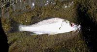 久々の「海フライ」です。もしや、イナダなどサーフからお顔を見せて くれるか?・・・で10番シューティングヘ ッドをキャス・キャス・キャス・・・はい、 空しくなりました。序徐に向かい風も出キャ スティングにも集中力の切れ間が・・・・。 川東突堤では相棒Kうじ共々サヨリごときに 翻弄される始末。 救い?はKうじの6番竿に写真の可愛くも元 気なヤツが出てくれたこと。 ![]() にうごめくのは・・・・ハゼでしょうか。岸よ りの影に群れなす魚影、スズキの当歳魚でし ょう。流芯ではモジリもあります。 ![]() さびき釣師に混ざりキャストを繰り返す。 相棒Kうじのフライに「何か」が・・・・。 Taichiも加わりキャスト・リトリーブ。 フライを追っては来るのですがなかなかバイト してくれません。 正体不明のアタリが遠ざかったころ出てきたのが カマス君。コレもやが遠ざかり、風も冷たく本日 コレまで。 ![]() &リリース、が二人の成果でした。 | ・ |