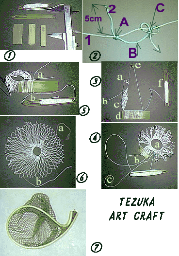 を通して左手前に回し、次に1の糸の下から右側上に回し、手前で先の糸にくぐらせて引