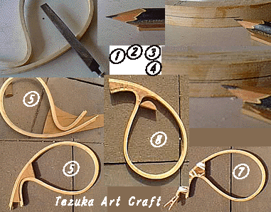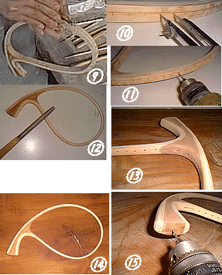 木工ヤスリでフレームのラインとぴったりE 糸のこなどで線に合わせて切り出しマス。 合うよう調整します。 グリップのネット側端面のカットは接着後の 方がきれいにいきますので、アトで。 グリップ接着! ヒモでしっかり固定しておきマス。 しっかり硬化したらヒモをはずし、開口部を糸 のこなどでカットしましょう。フレーム材のはみ 出た部分もカットしておきましょう。 これで形が出来上がりました。糸のこの作業がちょっと大変でしたか? 一息入れたら次の作業に取りかかりマスか。 |