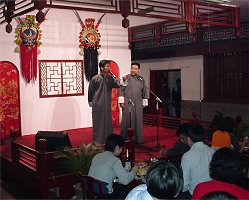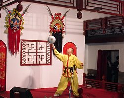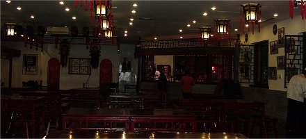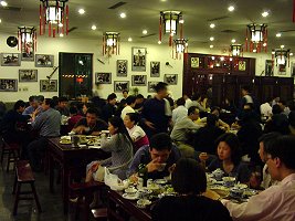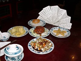 店に到着すると開放前の衣装に肩に毛巾(手ぬぐい)をかけたいなせなあんちゃんたちのお出迎えです。 席に案内されると肩にかけた毛巾でパンと埃を払いってくれます。 更に席につくと手練の技で折りたたまれた菜譜をテーブルの上にひろげ、この店の特色菜について要領良く説明してくれます。