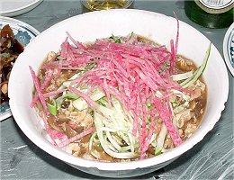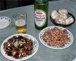 以前読んだ本によると、これは昔の中国の福建省あたりの人の書いたものだったと思いますが、北方の人の食事はとても質素で一品か二品のおかずに大蒜を齧りながら強い酒を飲むといったようなことが書いてあったかと思います。 ここはまさにそのようなスタイルが似合う店で思わず二鍋頭が飲みたくなってしまいます。 10数年前中国へはじめて行ったころは紹興酒がやたらと安くて水より安い紹興酒などといっていたものですが、今の北京では二鍋頭がばかやすです。 国宴 無名居でさえ大瓶一本が10元しません。 これではホテルで飲むミネラルウオーターよりはるかに安いです。 しかしこんな強い酒水みたいにのんだらやばいことになりそうなので今回は飲酒を断念いたしました。