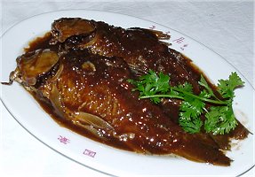 荷包[魚即]魚は鮒のお腹に肉などを詰めて煮た揚州の家庭料理です。 甘露の色に輝くこの料理は味のほうもなかなかに行けてました。 分店で食したもののうちでは一番気に入っております。