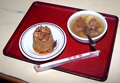 筒仔米[米羔]は筒の形の容器に糯米、豚肉、鳥蛋を入れて蒸して作ります。 排骨湯も取り合わせる具が苦瓜、芋仔、金針菜などがあります。